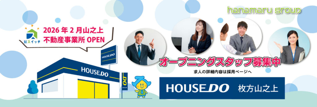 2026年2月より不動産売買仲介専門FC加盟店「HOUSE DO枚方山之上」がオープンします。それに伴いオープニングスタッフを大募集!