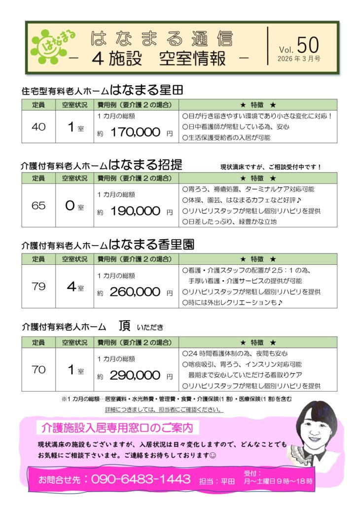 【施設空き情報】3月 はなまる有料老人ホーム空き情報 2026 2/28 施設空き状況 2026年2月28日 平田 入居総合窓口の平田です。下記まで、お気軽にお問合せ下さいませ(^^♪ご見学依頼もお待ちしております! 共有: Facebook で共有 (新しいウィンドウで開きます) Facebook X で共有 (新しいウィンドウで開きます) X 施設空き状況 この記事が気に入ったら フォローしてね! Follow @hanamaru8708 Follow Me 【保育園】2026年度4月 はなまる保育園 新入園児募集(対象0~2歳児) 関連記事関連する記事はまだ見つかりませんでした。