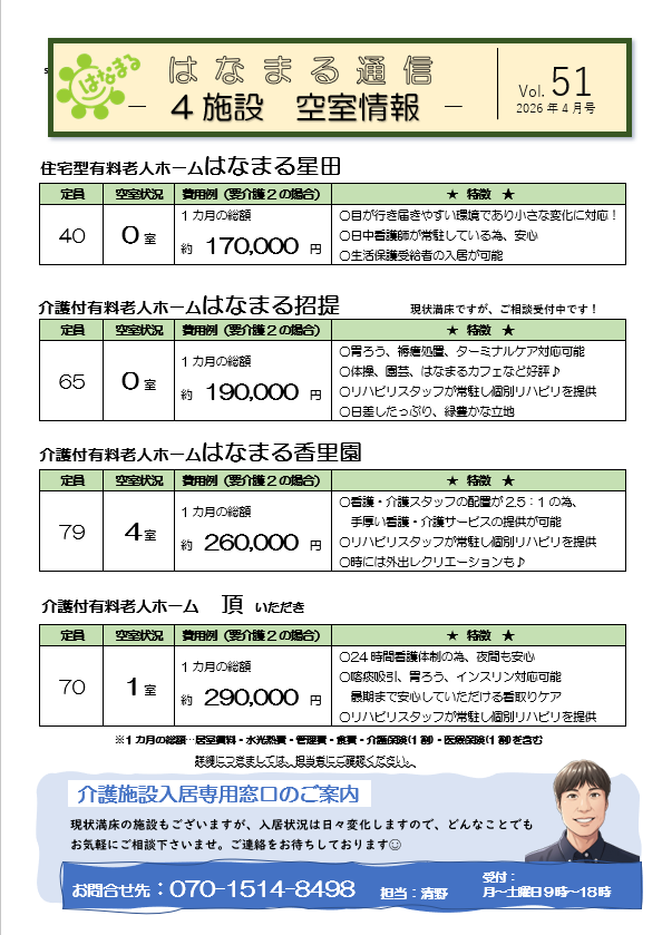 【施設空き情報】4月 はなまる有料老人ホーム空き情報 2026 4/01 施設空き状況 2026年4月1日 清野 入居総合窓口の清野です。下記まで、お気軽にお問合せ下さいませ(^^♪ご見学依頼もお待ちしております! 共有: Facebook で共有 (新しいウィンドウで開きます) Facebook X で共有 (新しいウィンドウで開きます) X 施設空き状況 この記事が気に入ったら フォローしてね! Follow @hanamaru8708 Follow Me 3/14.15「HOUSEDO 枚方山之上」OPEN記念イベントやってます! 関連記事関連する記事はまだ見つかりませんでした。
