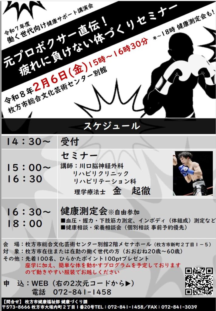 枚方市健康づくり課が主催する、元プロボクサーで現役理学療法士の金起徹先生による、体を動かしながら学べる新感覚セミナー。健康づくりに関する知識と実践を交えながら楽しく学べます!