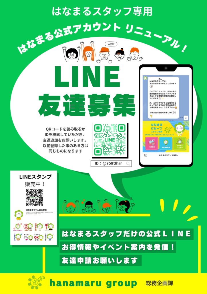 はなまるグループスタッフ専用のLINE公式アカウントとなります。下記の友だち募集から追加するかQRコードを読み込んで下さい。お得情報等など配信されます。