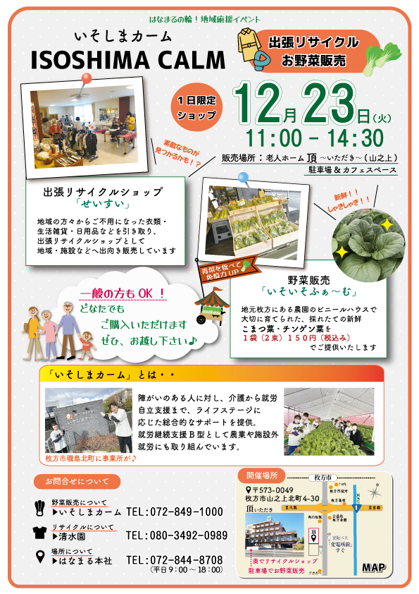 12/23(火)11:00~14:30 有料老人ホーム頂いただき(山之上)駐車場&横のカフェスペースにて「障がい者複合施設 いそしまカーム」さんによる、新鮮なチンゲン菜と小松菜の野菜販売と衣類や日用品雑貨の出張リサイクルショップ「せいすい」を開催し...