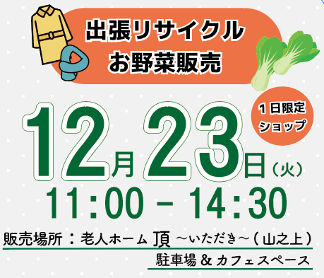【一般の方も購入OK】1日限定開催!12/23(火)野菜販売・出張リサイクルショップのご案内