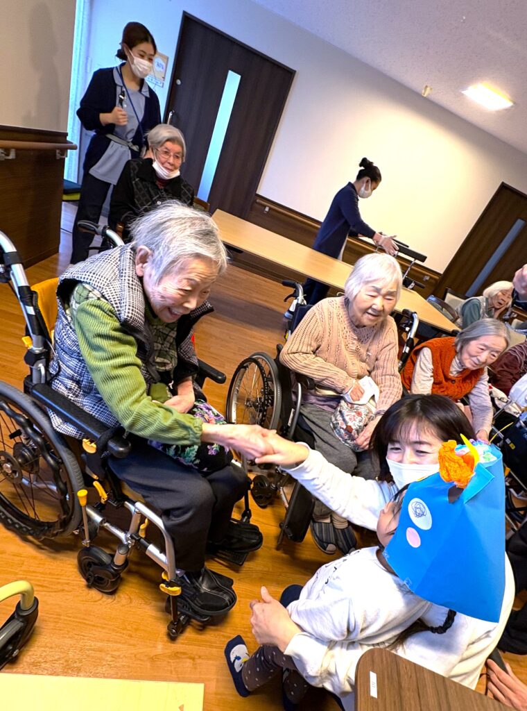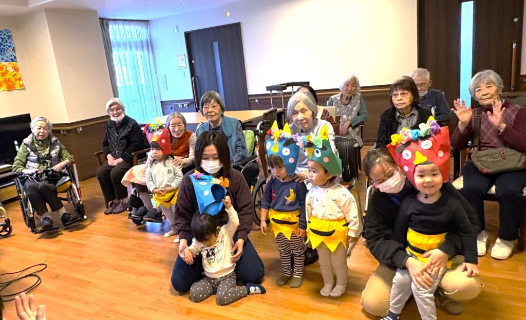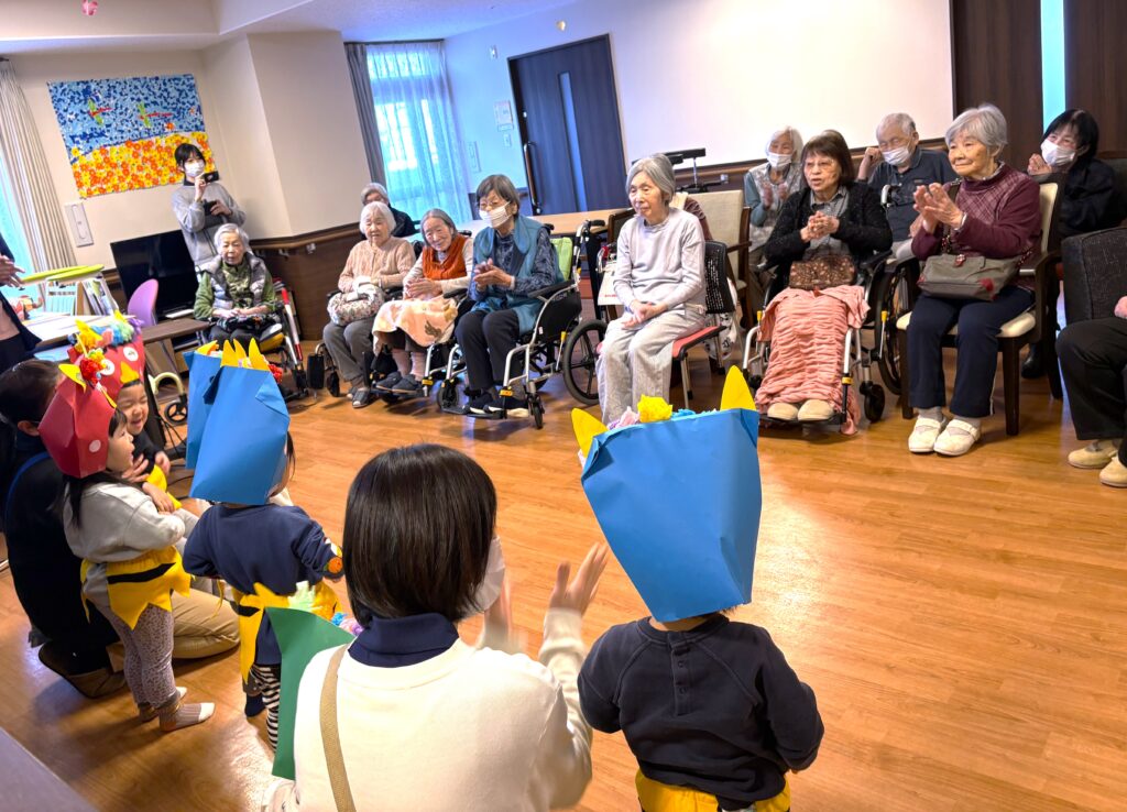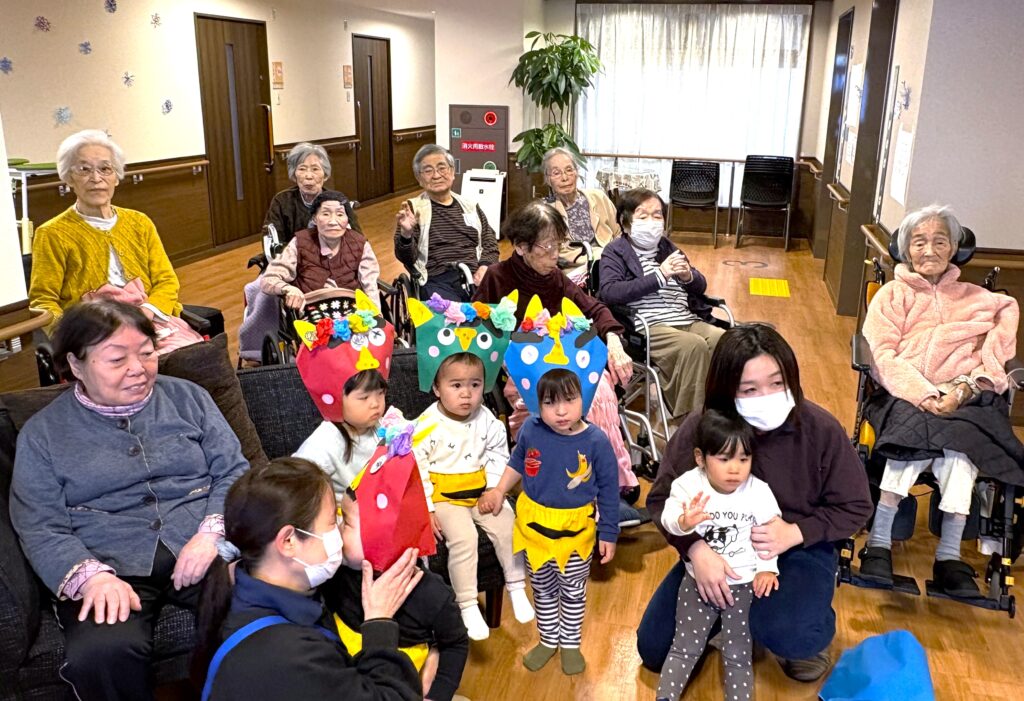 2月に入り立春を迎えましたが、寒さはまだまだ厳しい日が続いております。皆様いかがお過ごしでしょうか? さて、先日2月2日は節分でしたね👹頂には、お隣の保育園の可愛らしい園児さんが歌を届けにきてくれました✨園児さんたちの元気いっぱいの歌声と愛らしい姿に、入居者様の笑顔が溢れ、心も身体も温まるひとときとなりました。
