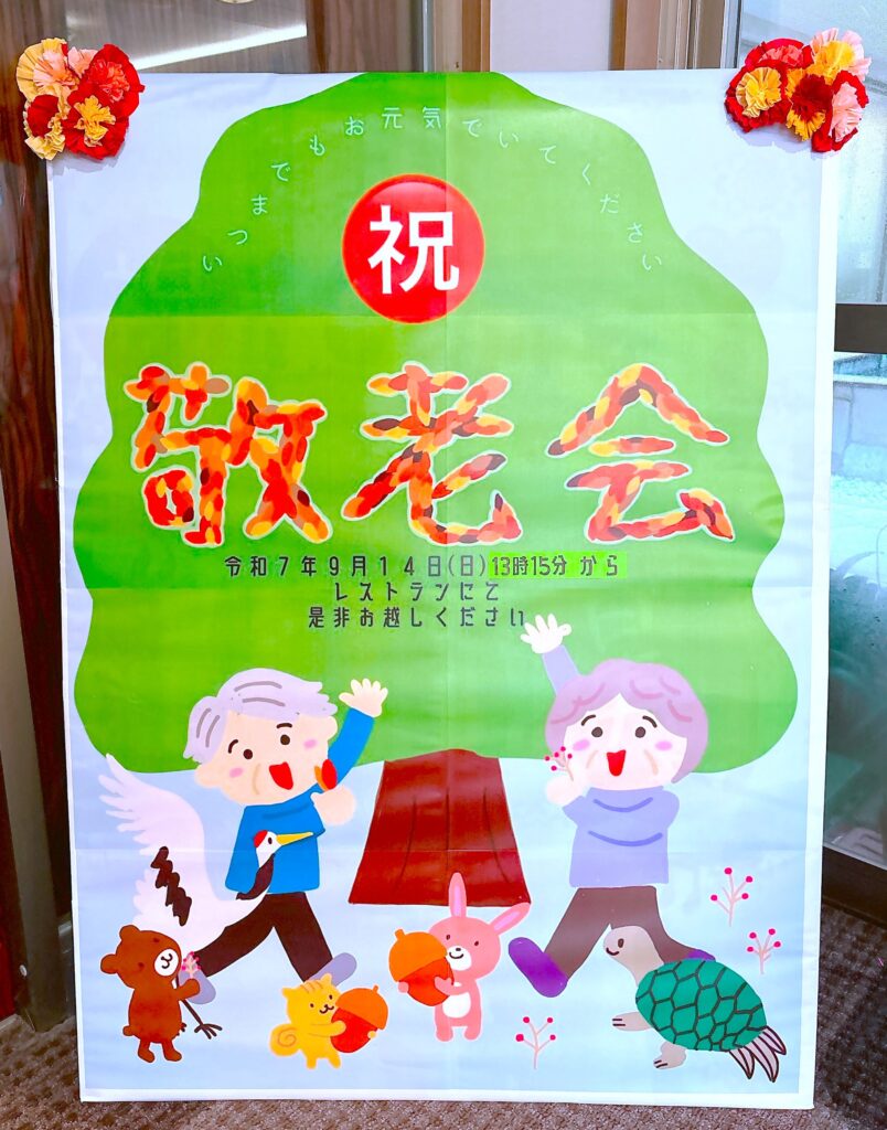 14日施設にて『敬老会』を開催いたしました❗ 施設長からの心温まる挨拶に始まり、米寿や白寿などの節目を迎えられた方々への感謝の賞状贈呈を行いました。そして、今年100歳(百寿)を迎えられた代表の方による、くす玉割り🎊では「おめでとう❗」の声とともに会場が華やかに盛り上がりました✨