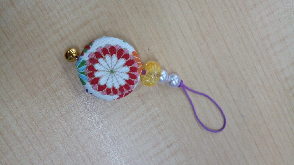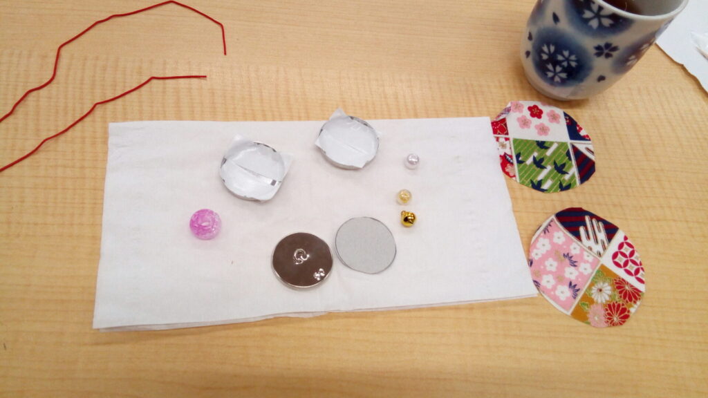 くるみボタンや鈴、和柄の端切れ布を使用します。