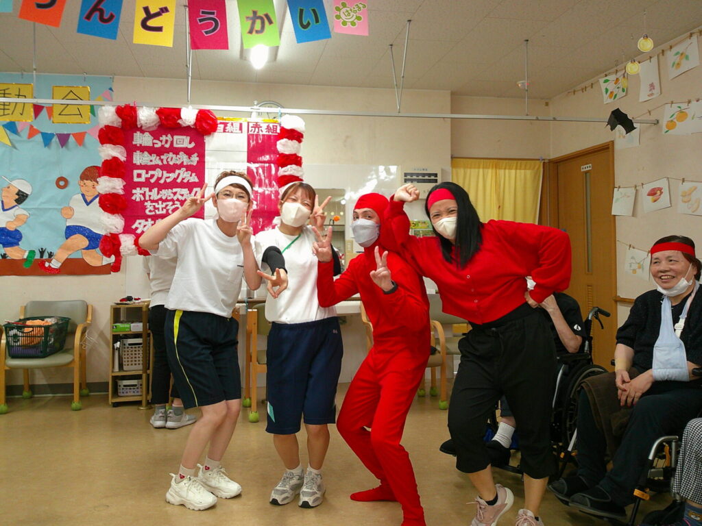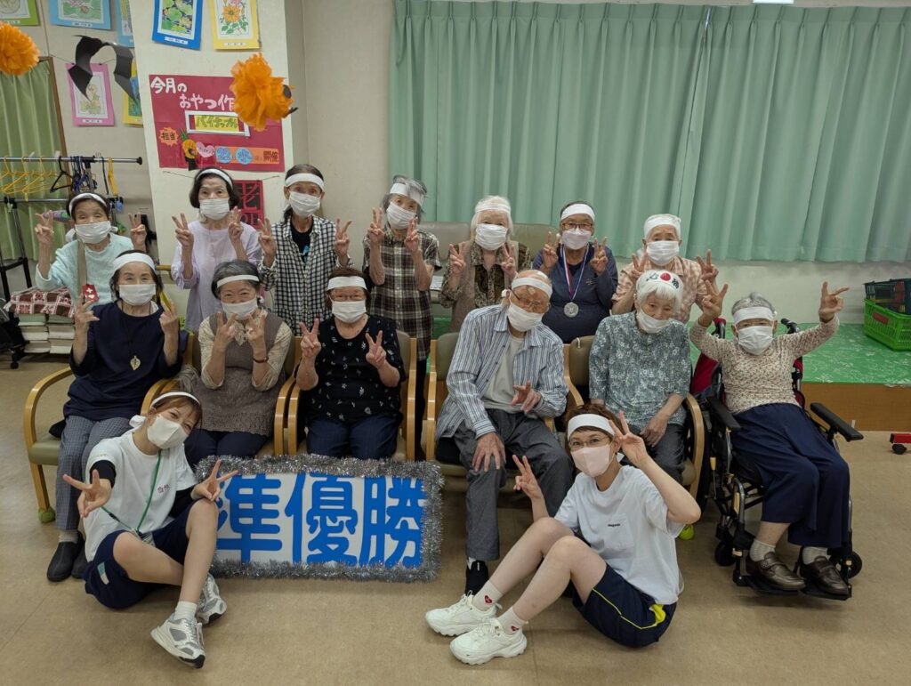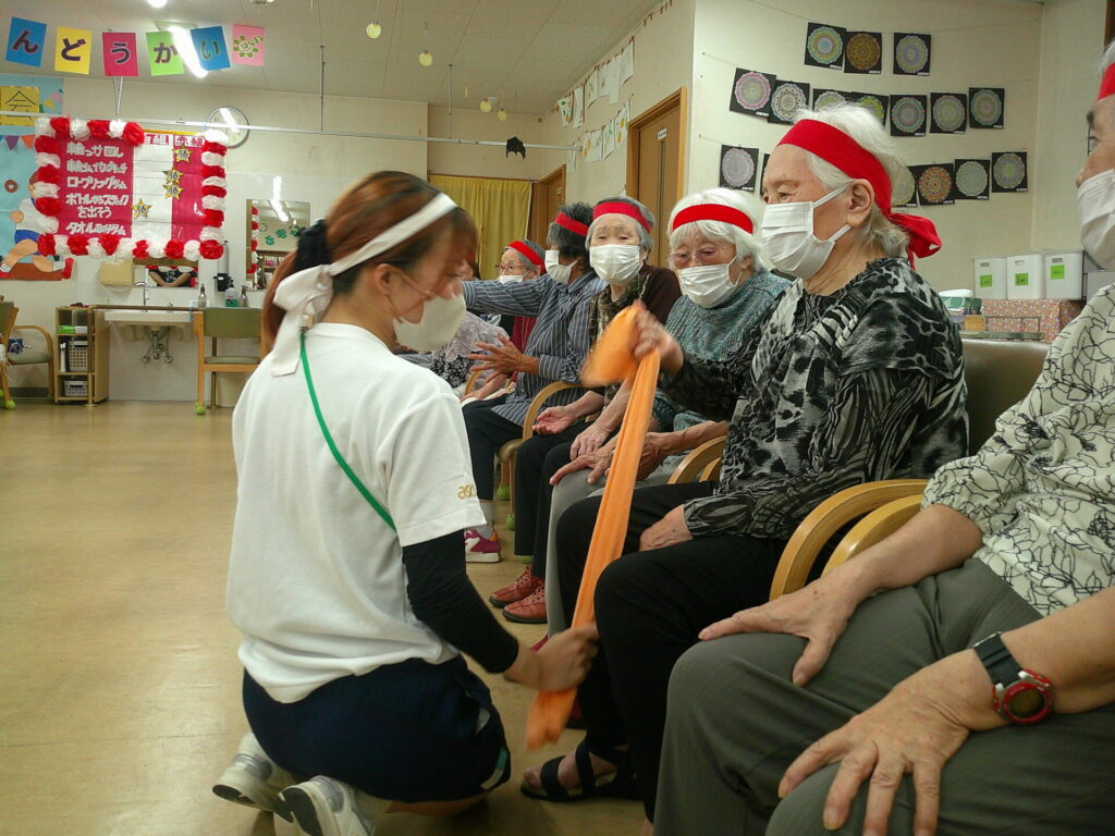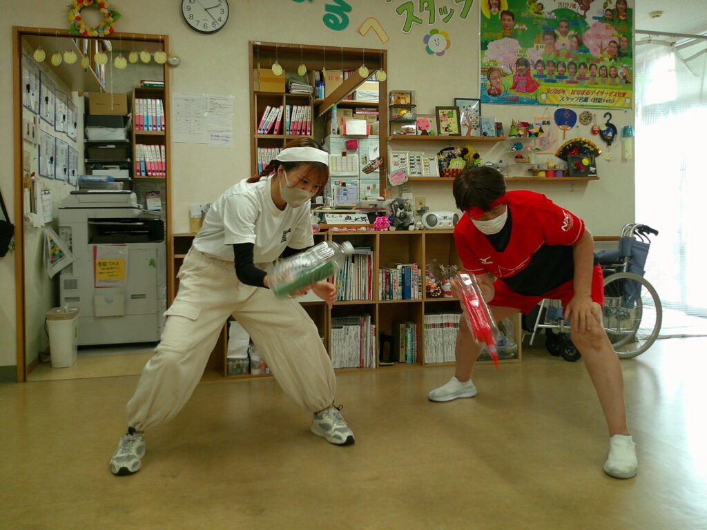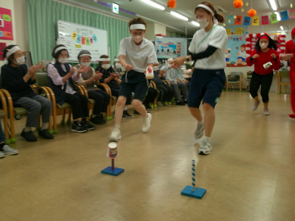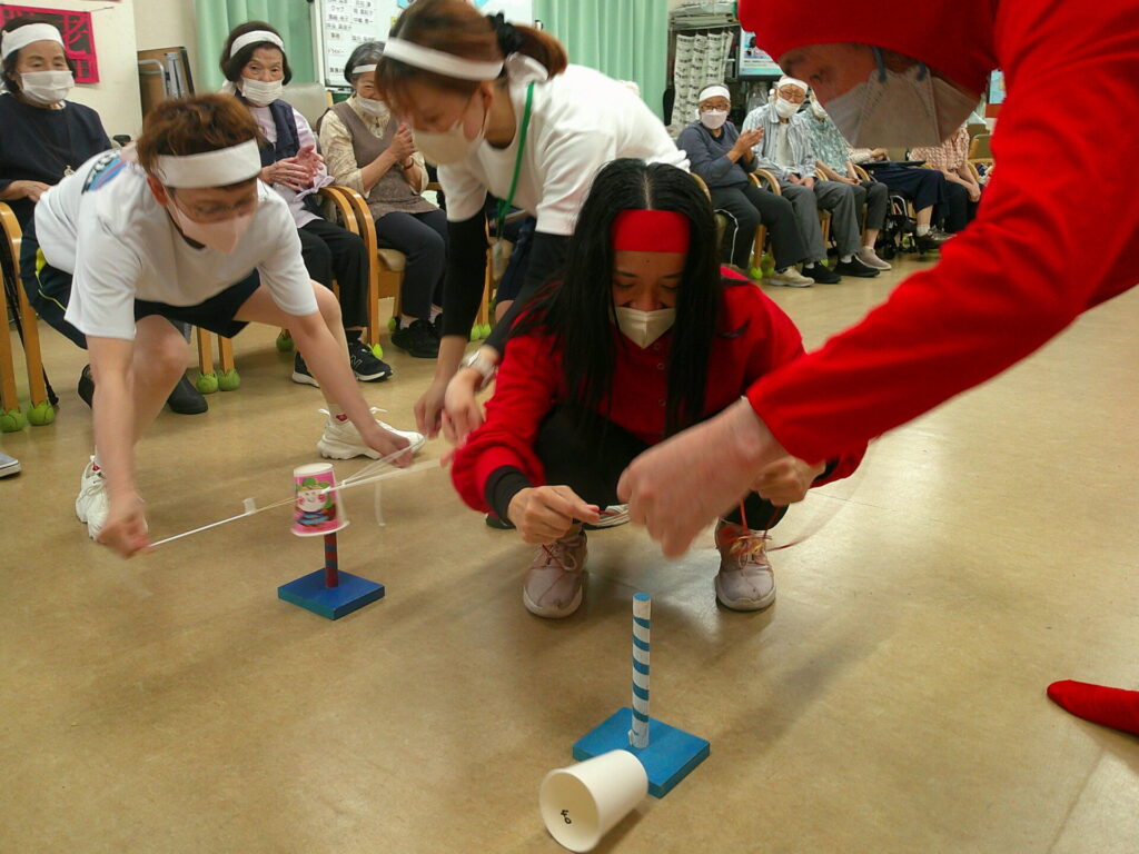 次の種目はスタッフによるカップを輪ゴムではみましょゲームです。スタッフも必死に頑張って参加しました。