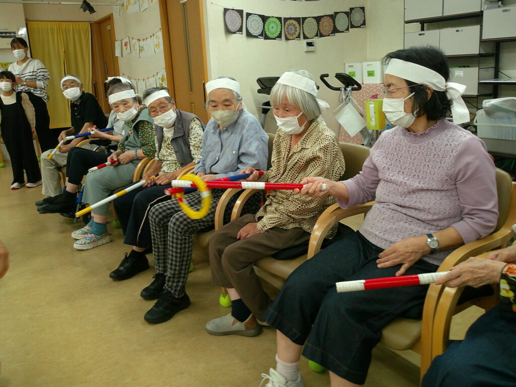 一つ目の種目は輪っか送りゲームです。隣の方にどんどん棒を使って輪っかを送ります。