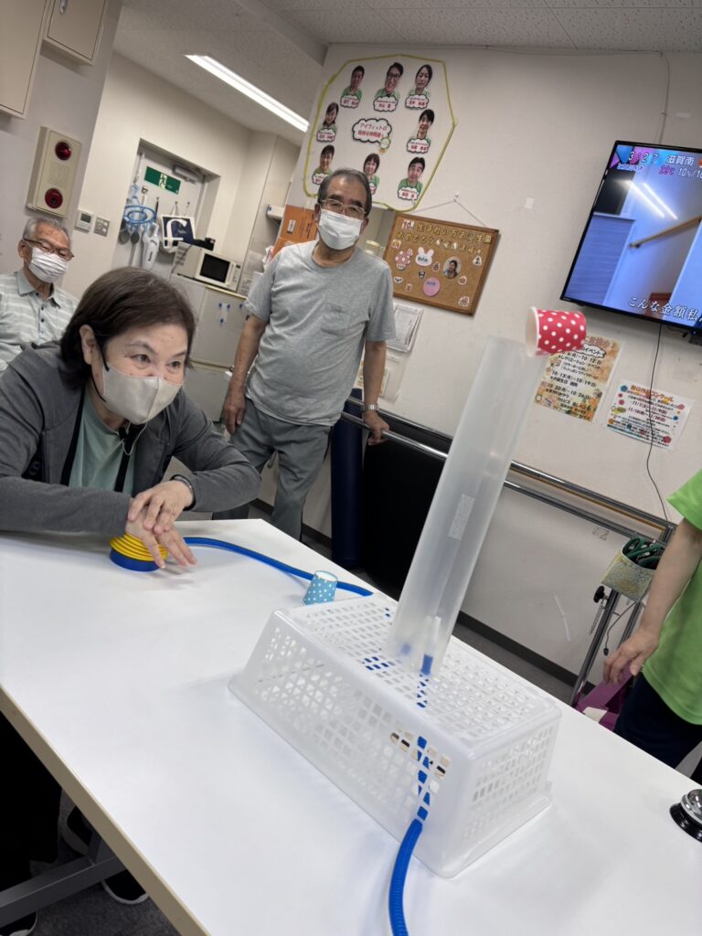 二人でポンプを押して中央筒に入ったコップを外に押し出すゲーム🎮文字通り息が合わないと中々出てこない。