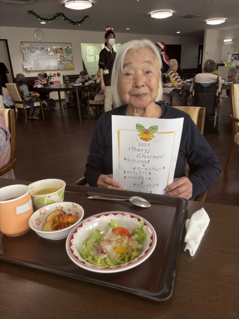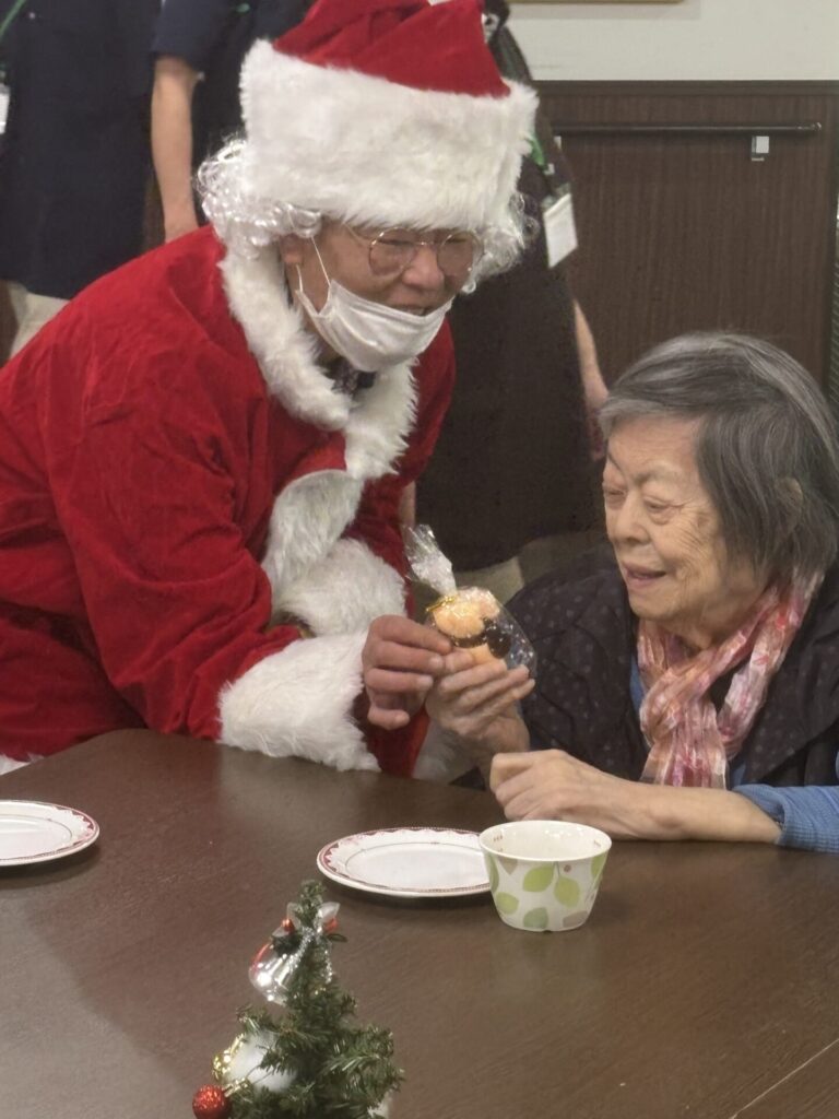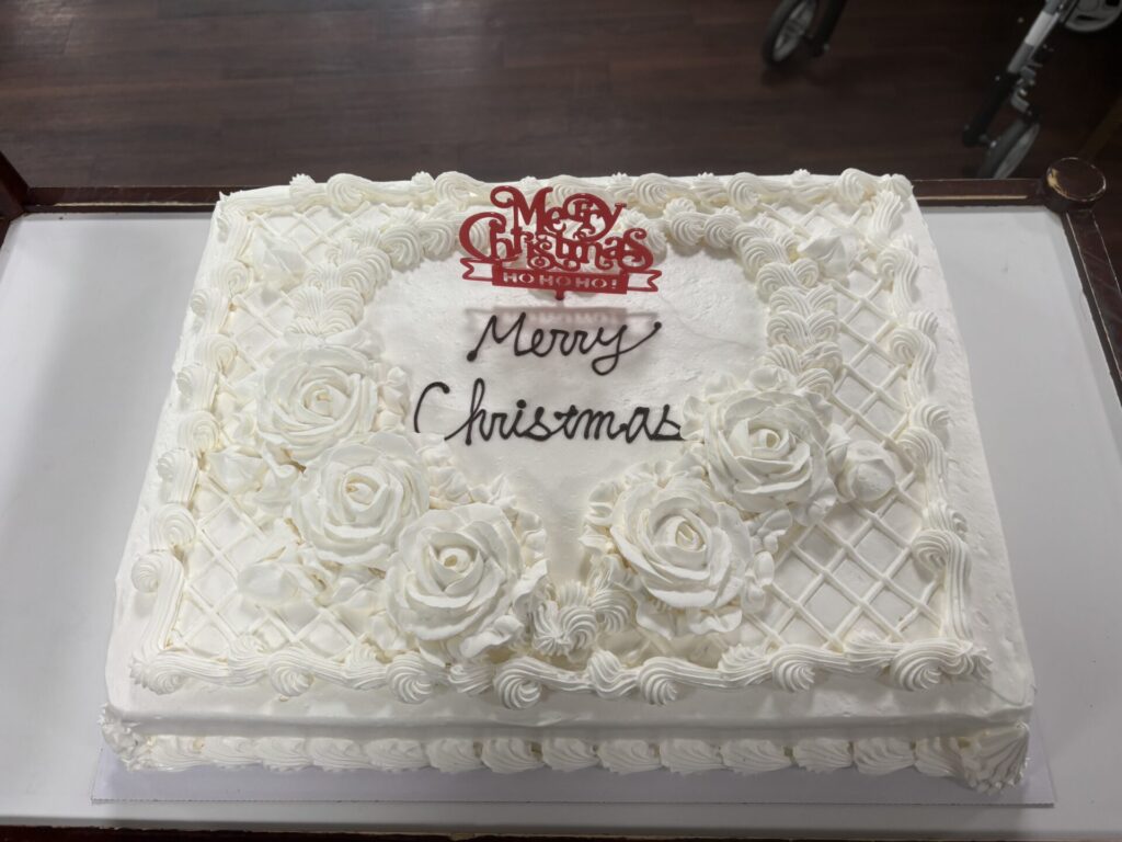 今年は昼食時に花萬特製クリスマス特別メニューとケーキを提供しました。食事のレイアウトもいつもとは違う雰囲気で召し上がっていただきました。