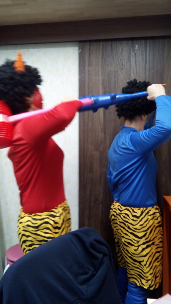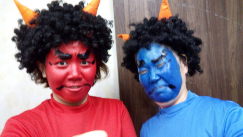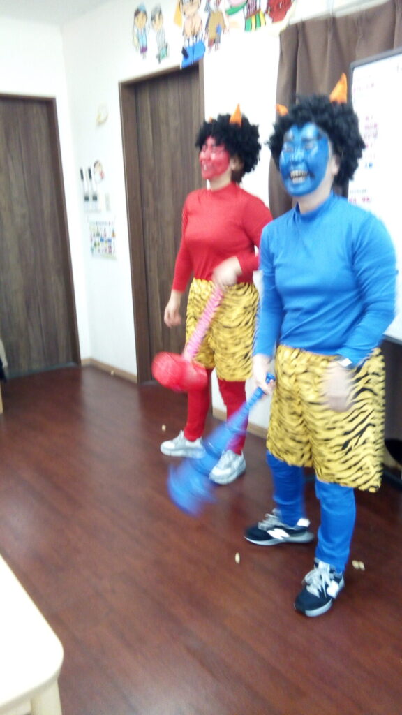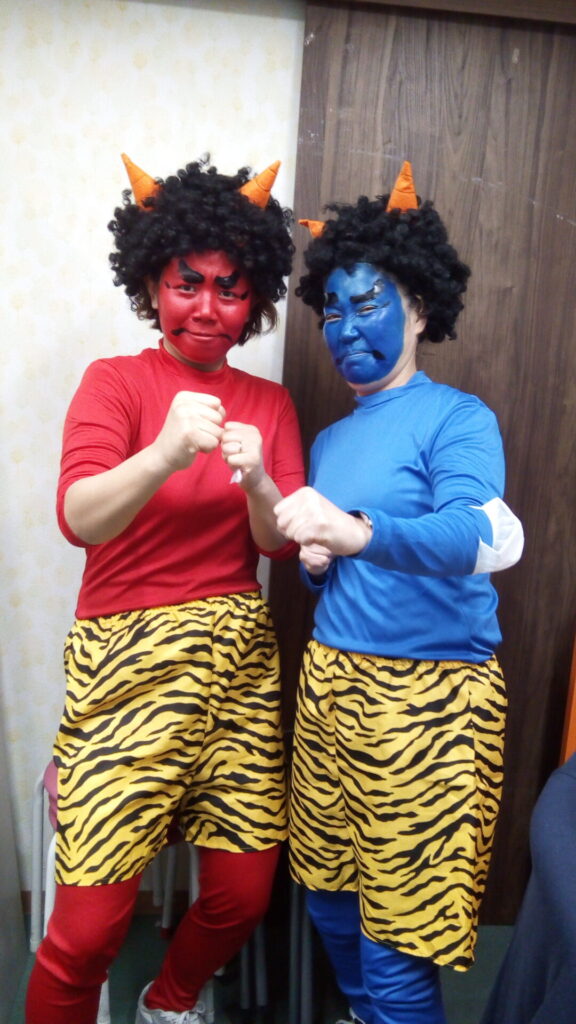 着替えるまでは、にこにこ笑顔だったのに、着替えてメイクをしたら鬼になりきっちゃって
