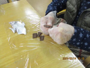 みなさんにチョコレートをパキパキと細かく割って頂き