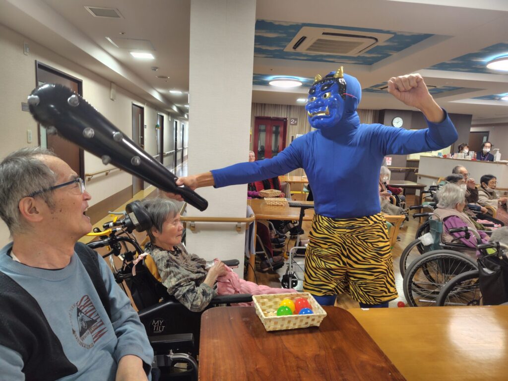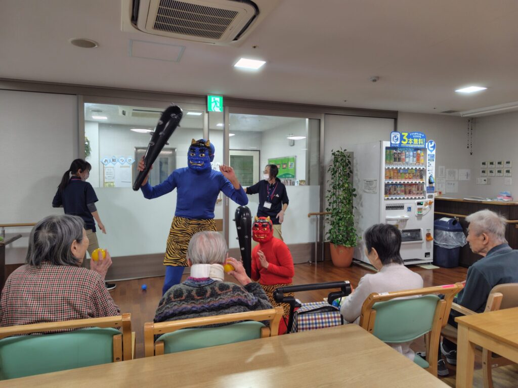 当日はスタッフが赤鬼・青鬼に扮し、入居者様から豆の代わりのカラーボールを投げてもらいました🔴🟡🟢