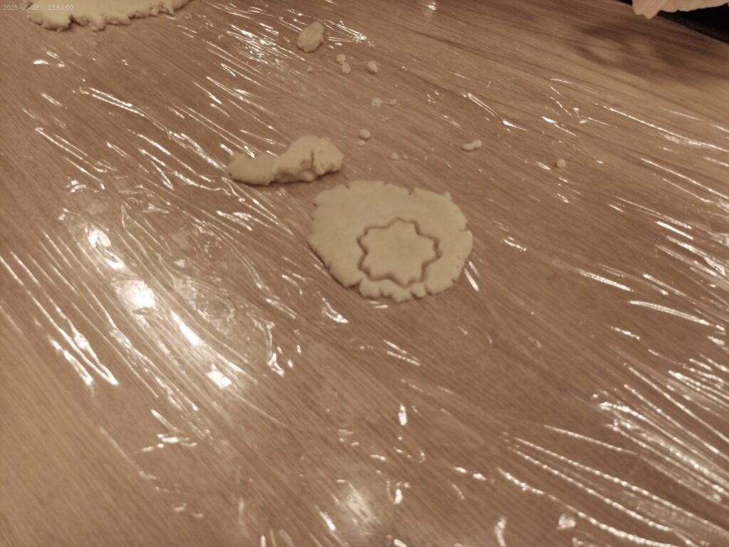 材料の薄力粉・バター・粉チーズ・ワサビを混ぜてこねて型取りしていきます![]()